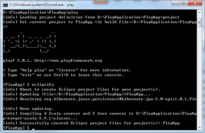 接著我們要將這些檔案透過 Play Framework 設定專案成為 Eclipse 可讀取的檔案,所以我們需要先進入 Play Framework 所提供的操作畫面,這個畫面提供了許多往後要使用的操作命令,相關指令可以參考官方文件。進入 D:\PlayApplication\PlayApp 輸入 play 之後,便可以看到操作畫面,